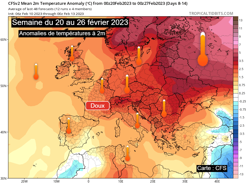 Anomalies de températures sur l'Europe pour la semaine du 13 au 19 février 2023 – ECMWF