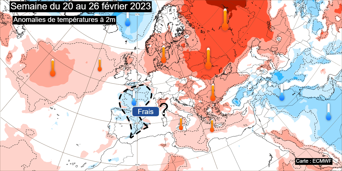 La semaine suivante semble un peu plus indécise au niveau des températures. Le blocage anticyclonique pourrait en effet présenter quelques faiblesses et laisser place à des masses d'air sensiblement plus rafraîchies pour la fin du mois de février. C'est en tout cas l'option choisie par le modèle européen ECMWF avec des anomalies de températures sensiblement négatives sur notre pays durant la semaine du 20 au 26 février, rien de vraiment froid pour autant cela dit.