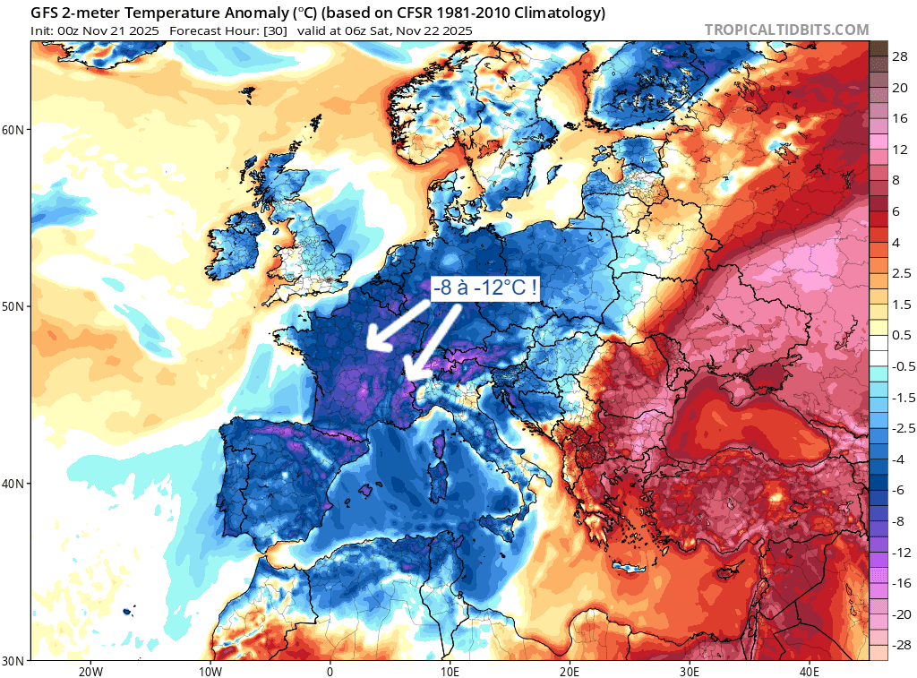 Anomalies de températures sur la France pour le samedi 22 novembre 2025 – Via TropicalTidBits