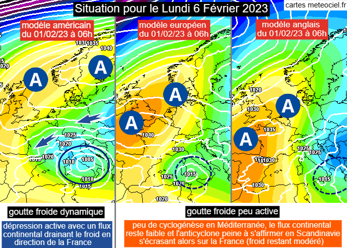Situation au 6 février 2023 selon les modèles américain, européen et anglais - via meteociel.fr