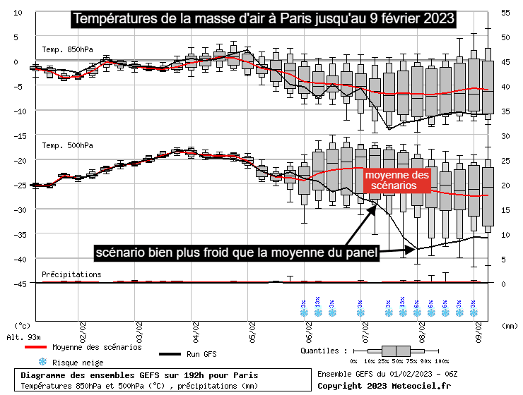 Panel des scénarios du modèle américain pour les températures de la masse d'air à Paris jusqu'au 9 février 2023 - via meteociel.fr