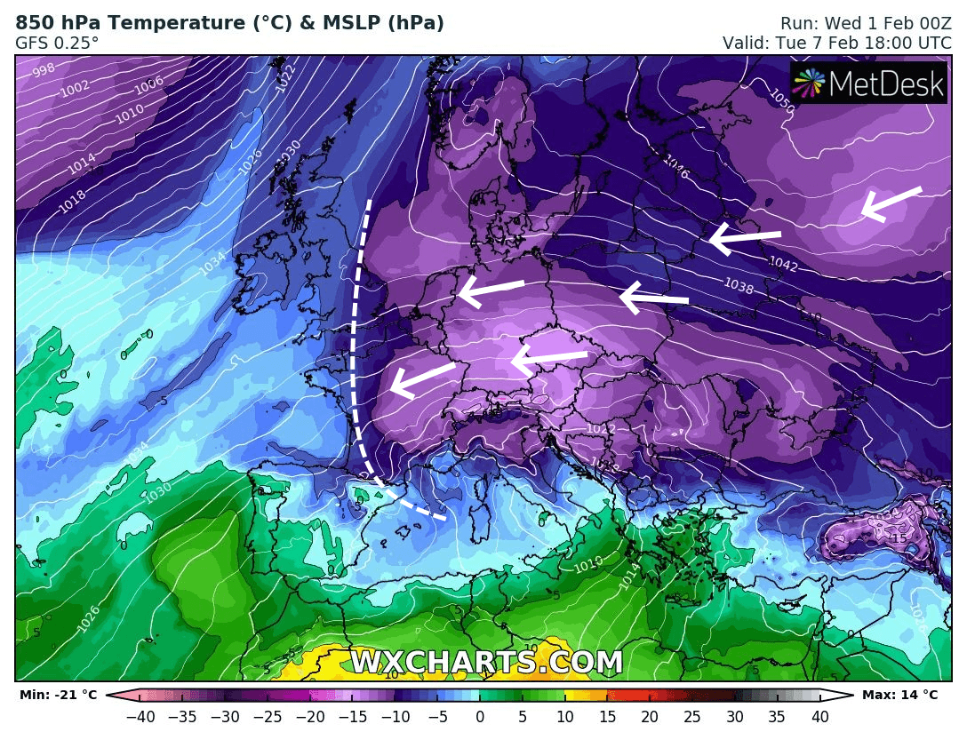 Masses d'air à 850 hPa (vers 1500m) pour le 7 février 2023 selon le modèle américain - via wxcharts.com