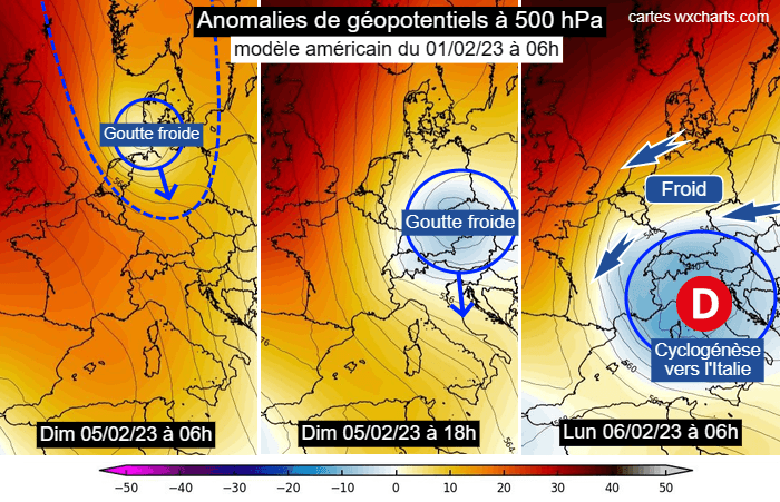La mise en place d'une éventuelle "vague de froid" pour la semaine prochaine passe par un enchaînement d'événements que projette le modèle américain. Ce refroidissement important serait initié par un talweg en Mer de Norvège, plongeant vers l'Allemagne ce dimanche 5 février 2023 où se formerait une goutte froide. Celle-ci plongerait ensuite vers l'Italie, favorisant la formation d'une dépression active dans les parages du golfe de Gênes. Celle-ci ferait alors office de "pompe à froid" en accentuant le flux continental de secteur nord-est sur la France et l'Europe Centrale, drainant l'air froid continental vers nos régions.