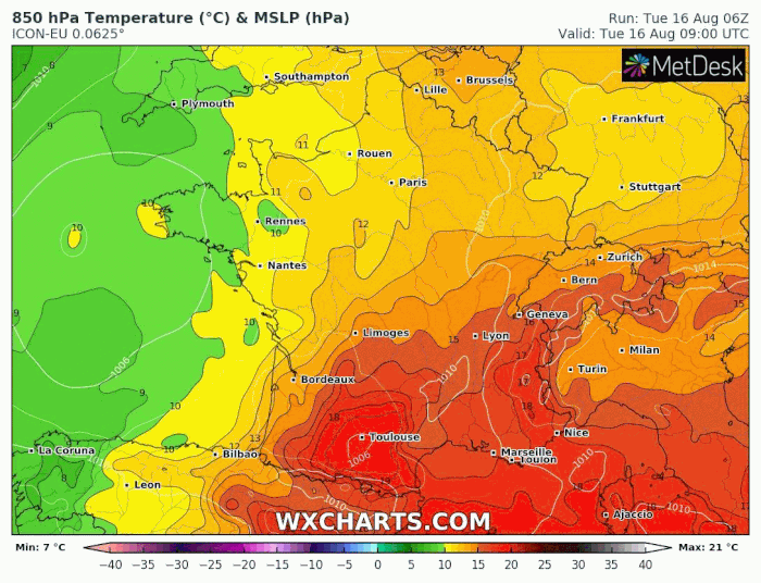 Masses d'air à 850 hPa (vers 1500m) en France les mardi 16 & mercredi 17 août 2022 - via wxcharts.com