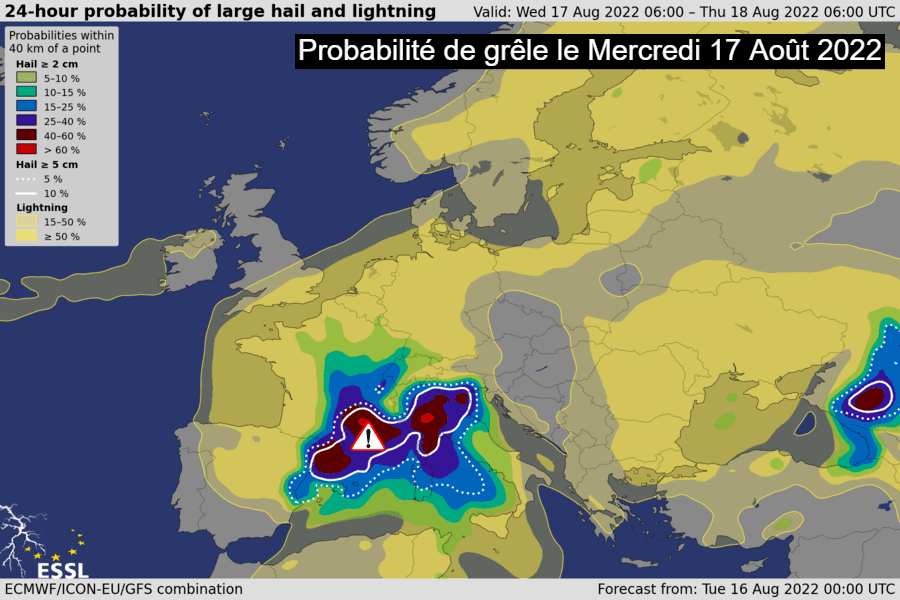 Probabilité d'observer de la grêle ce mercredi 17 août 2022 au soir - carte ESSL