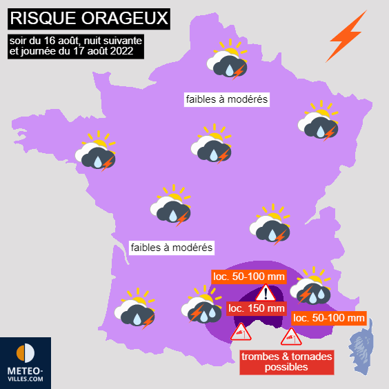 Risque orageux du mardi 16 août 2022 au soir au mercredi 17 août 2022 au soir - Météo Villes