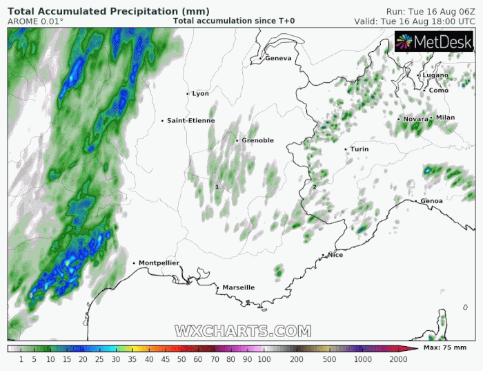 Cumuls de pluie selon le modèle AROME jusqu'au jeudi 17 août 2022 - via wxcharts.com