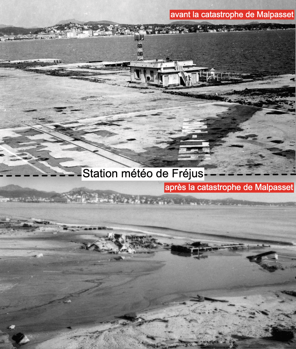 Cet événement catastrophique est indirectement imputable aux conditions météorologiques.  Suite à des précipitations exceptionnelles, le barrage de Malpasset, situé dans l’arrière-pays de Fréjus, cède dans la nuit du 1er au 2 décembre 1959.  De vastes zones géographiques ont ainsi été anéanties.