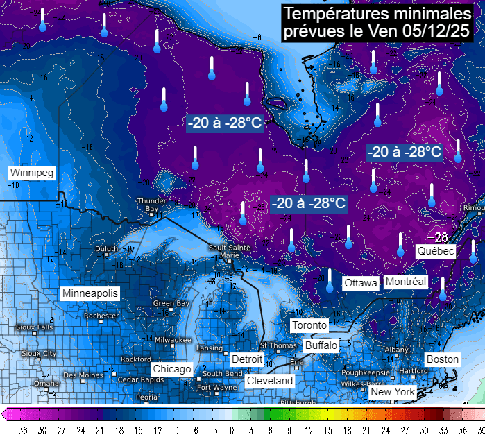 Ainsi, c'est un froid polaire qui va débarquer sur l'est du Canada et le nord-est des USA avec un pic attendu en seconde partie de semaine prochaine. Pour le matin du vendredi 5 décembre 2025, le modèle européen envisage des températures comprises entre -20 et -28°C sur une grande partie du Québec et de l'Ontario ! À cette heure, le modèle projette -20°C à Montréal et -26°C à Québec, des valeurs impressionnantes, même pour ces régions !