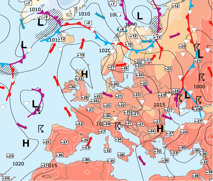 + Vendredi, les fortes chaleurs remonteront vers les régions du Nord et de l'Est, propulsées par une goutte froide d'altitude dénommée Dirk.