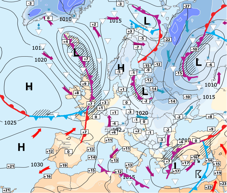 + Cette situation sera liée à la persistance d'une conflit entre l'air froid qui recouvrira tout le Nord de l'Europe, et l'air plus doux qui circulera plus au sud.