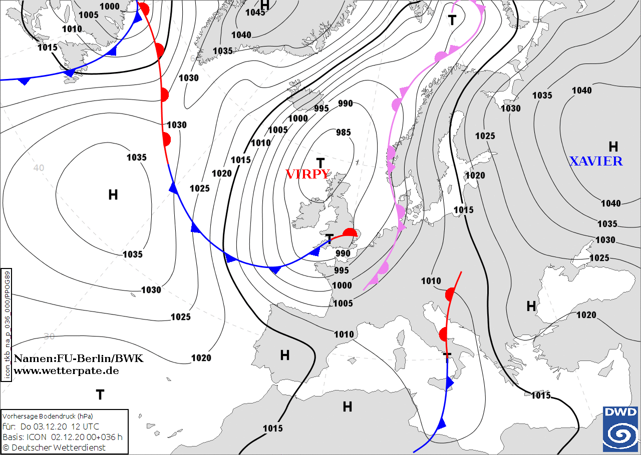 Noms des dépressions et anticyclones prévus pour jeudi 3 décembre 2020 à midi (Berlin)