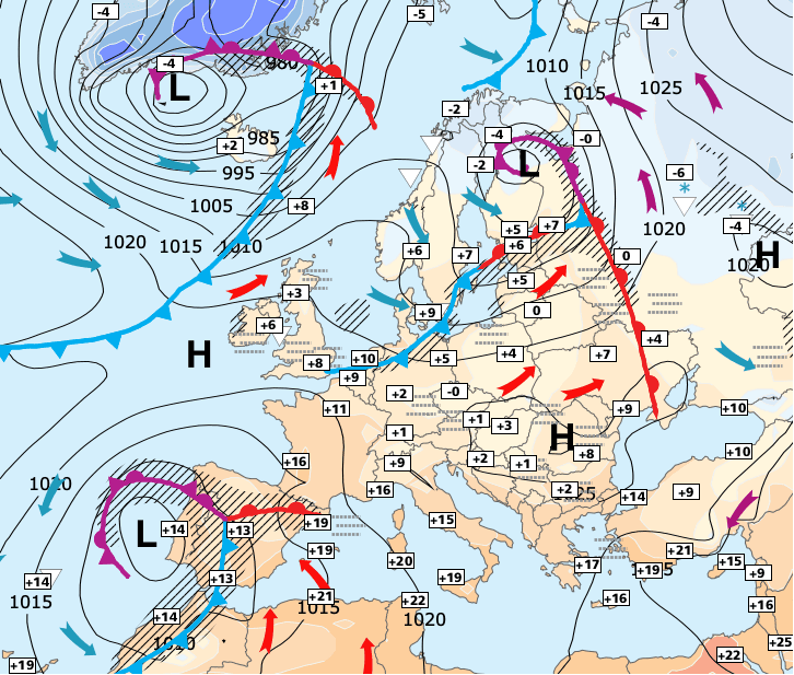 + La nouvelle cellule anticyclonique qui s'est formée sur les îles britanniques rejoindra la Scandinavie ce week-end. Ceci fera blocage aux perturbations océaniques et prolongera la période de temps calme et sans pluie sur une bonne partie de la France au moins jusqu'en fin de semaine prochain.
