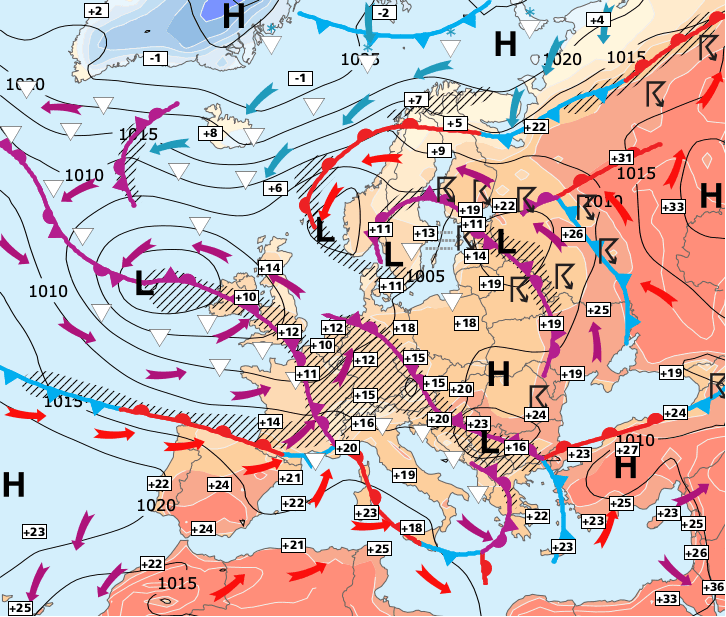 Noms des dépressions et anticyclones prévus pour dimanche 16 mai 2021 à midi (Berlin)