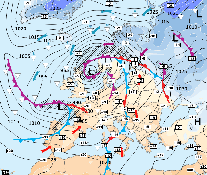 + Elle sera suivie d'un 2eme minimum circulant entre Nantes et Langres dans la nuit de jeudi à vendredi, parallèlement à un autre minimum (dénommé Irek par les allemands) qui occasionnera un sérieux coup de vent sur un grand quart Sud-ouest dans la matinée de vendredi !