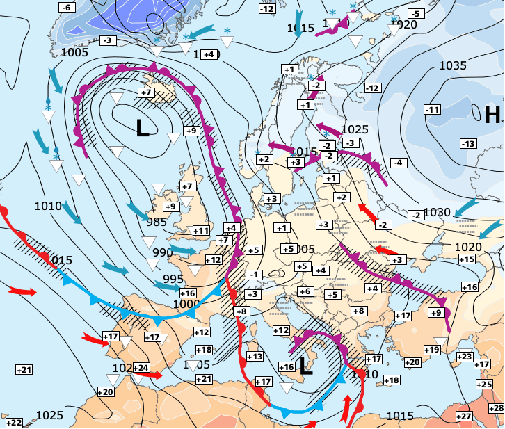 + En début de semaine, les perturbations atlantiques réussiront à s’infiltrer sur la France, mais elles auront tendance à perdre de leur activité en arrivant dans l'Est (se heurtant à l’anticyclone d’Europe centrale).