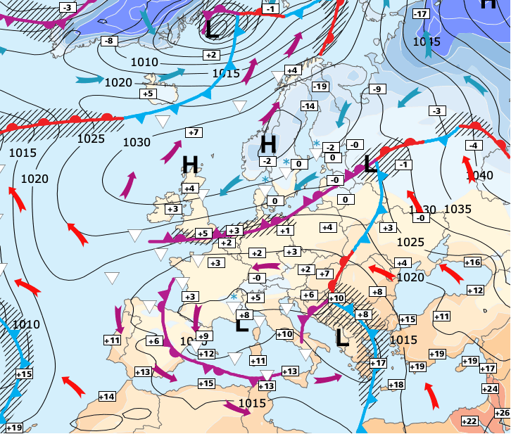 + Comme la masse d'air froid sera très étendue >>>, les perturbations circuleront au sud de cette masse d'air (entre l'Espagne et l’Italie) et pourraient déborder vers le Midi de la France à partir de jeudi soir.