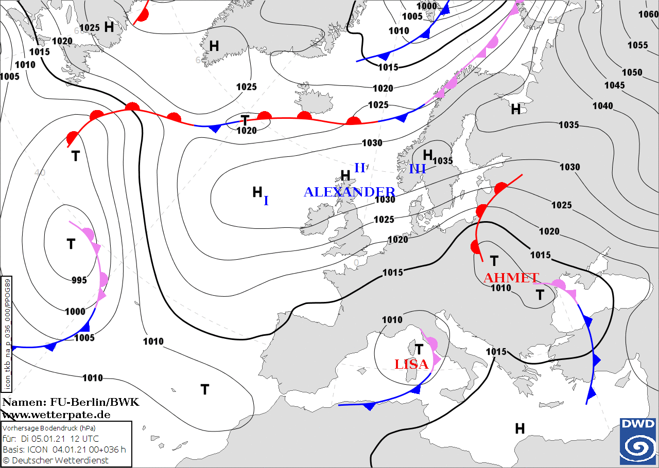 Noms des dépressions et anticyclones prévus pour mardi 5 janvier 2021 à midi (Berlin)