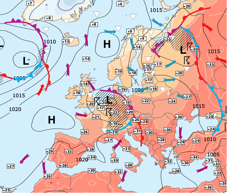 + Les températures seront assez élevées dans le Sud-ouest (plutôt influencé par l’air chaud circulant entre l’Afrique du Nord et l’Espagne), alors qu'il fera plus frais sur les régions du Nord et du Nord-est (air venu tout droit de Russie, Scandinavie et Pologne).