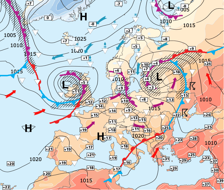 Noms des dépressions et anticyclones prévus pour mardi 4 mai 2021 à midi (Berlin)